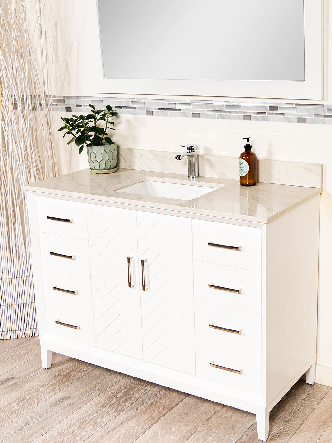 White herringbone vanity with quartz counter, chrome faucet and white mirror