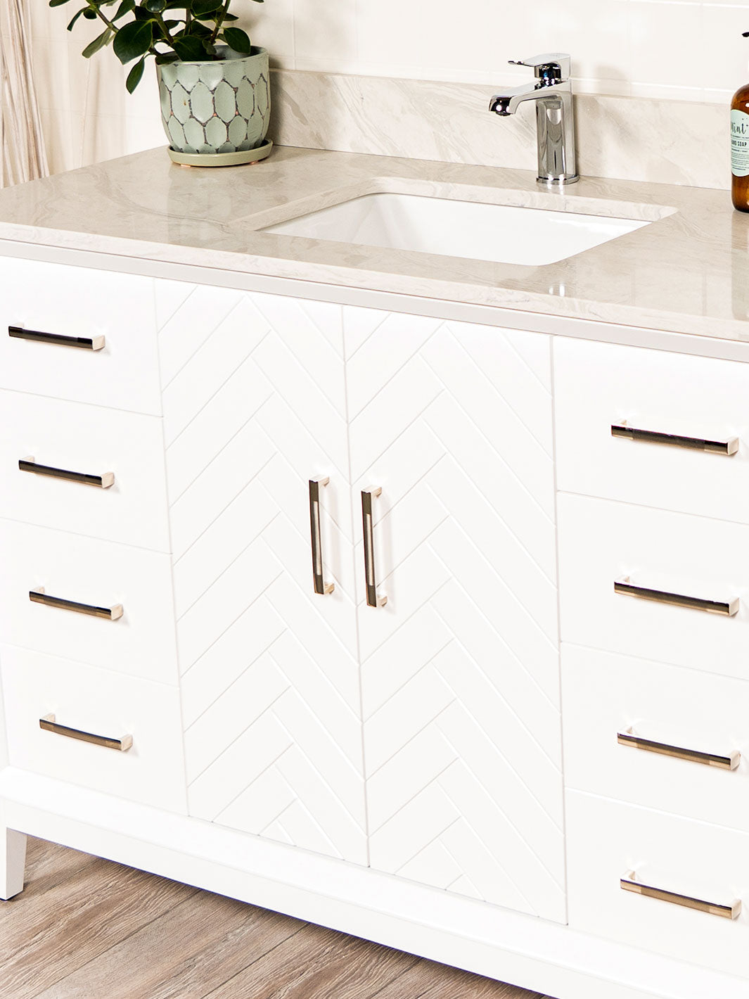 White vanity with herringbone pattern on the cupboard doors. Quartz counter and white framed mirror