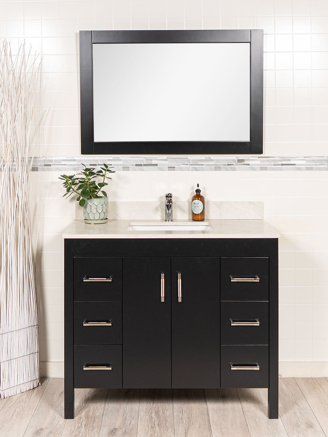 Bathroom vanity with black cabinet, white countertop, and black mirror