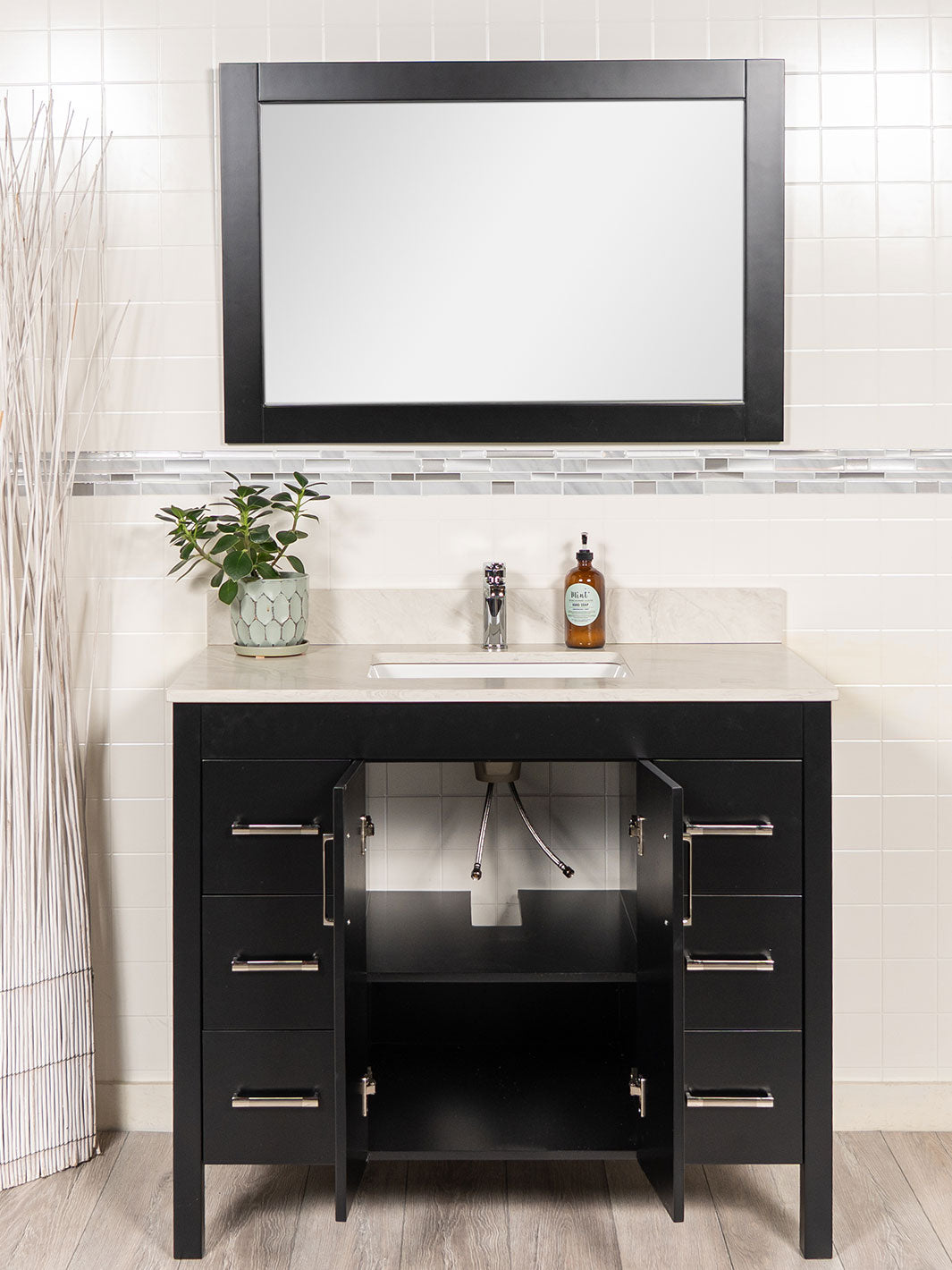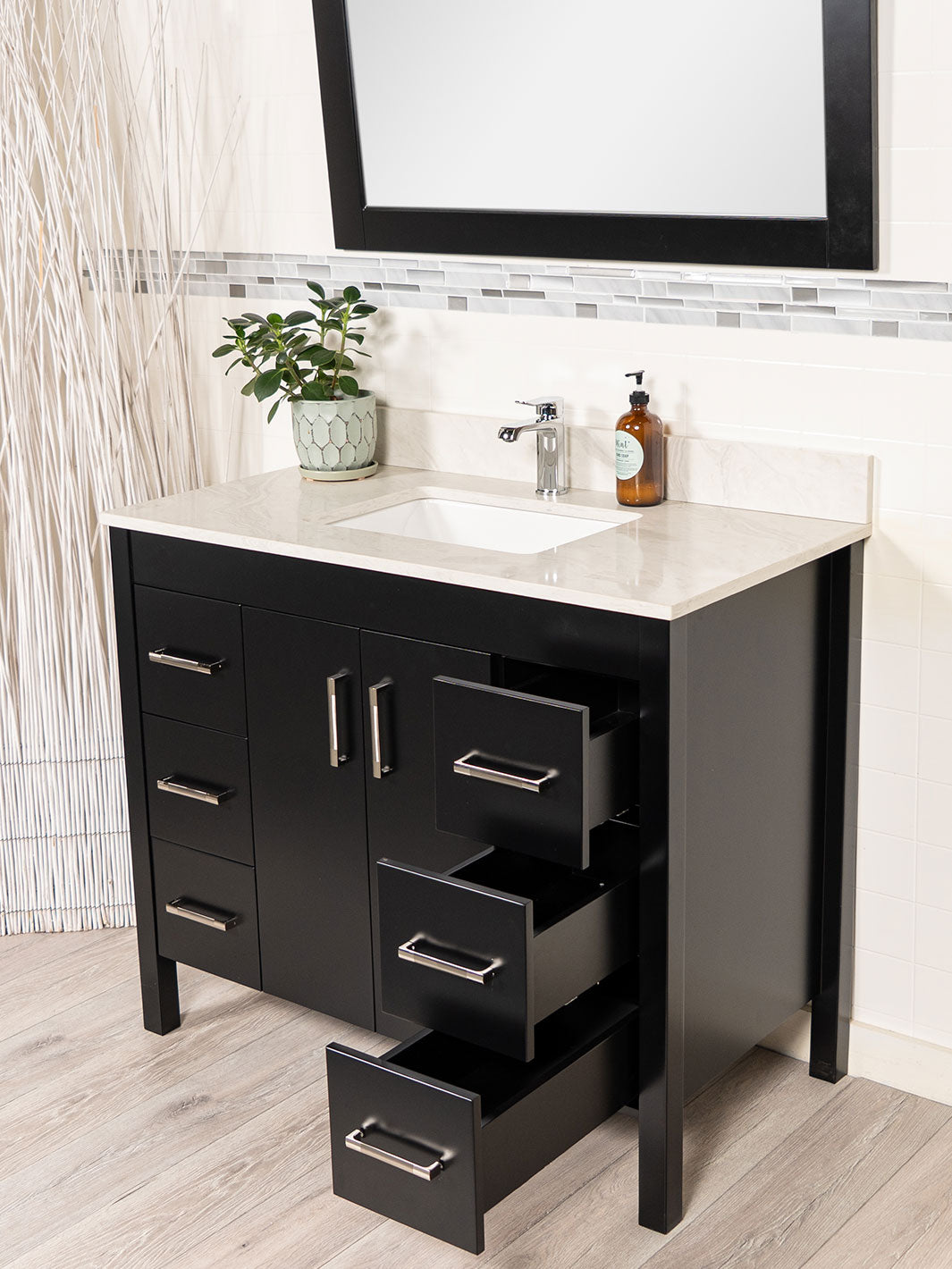 Upgrade your bathroom with this 42 inch bathroom vanity, designed to combine style and functionality. Featuring sleek flat panel doors and drawers, this vanity offers ample storage with 3 drawers on each side and a spacious cupboard in the center. The soft-closing doors and drawers ensure quiet, smooth operation, while the vanity comes fully assembled, making installation a breeze. Included in the price are the quartz countertop, back and side splashes, a faucet and a wood framed mirror.