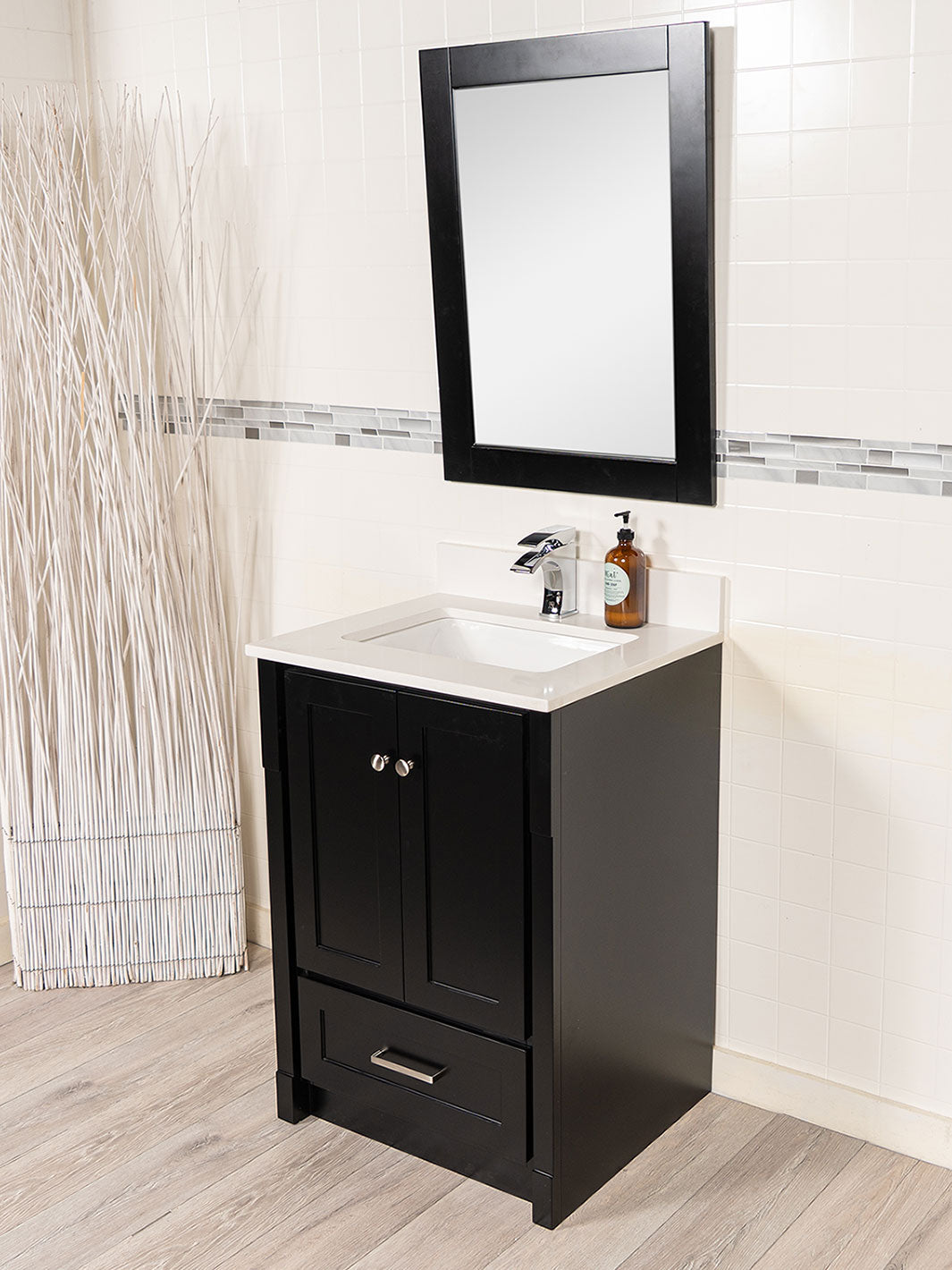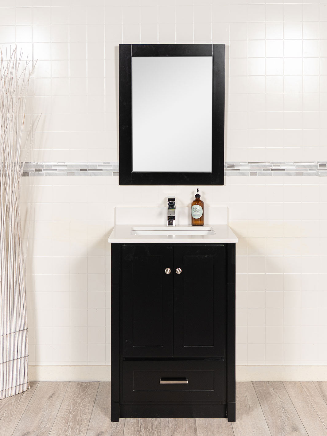Upgrade your small bathroom with this 24 inch wood vanity featuring a 25 inch quartz countertop. Designed for compact spaces, this small vanity offers both style and functionality. The elegant shaker style doors and bottom drawer provide storage space while maintaining a clean, timeless look. Made entirely of solid wood, this vanity is built to last.