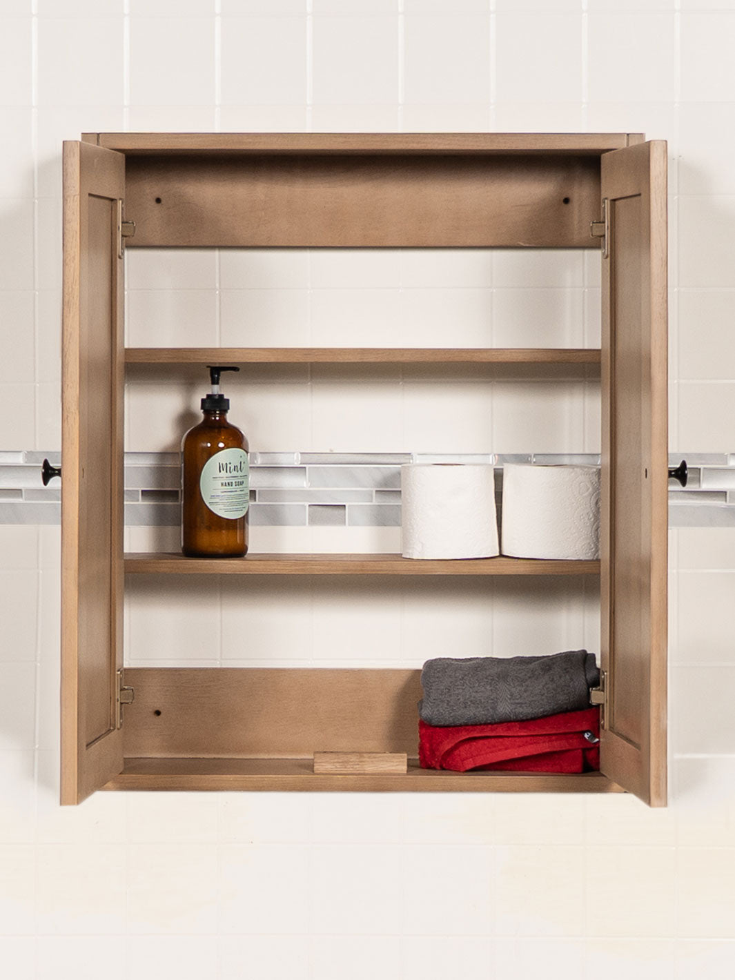 Wooden cabinet with shelves containing toiletries